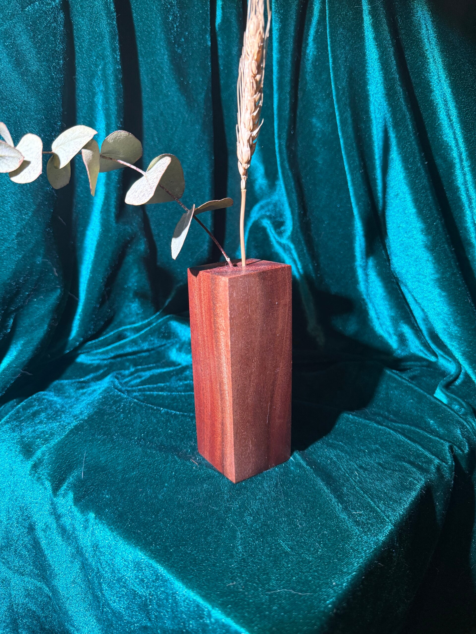 These bud vases can be arranged on a flat surface, around other wooden items, or together with other bud vases of different timbers and sizes.