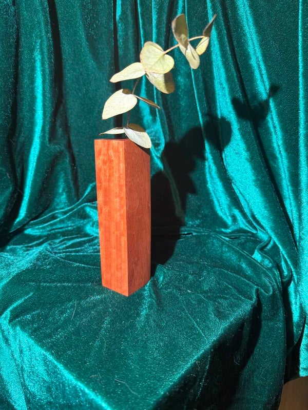 These bud vases can be arranged on a flat surface, around other wooden items, or together with other bud vases of different timbers and sizes.