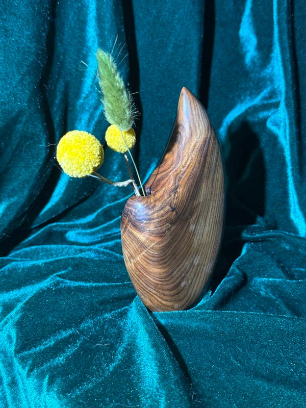 These bud vases can be arranged on a flat surface, around other wooden items, or together with other bud vases of different timbers and sizes.