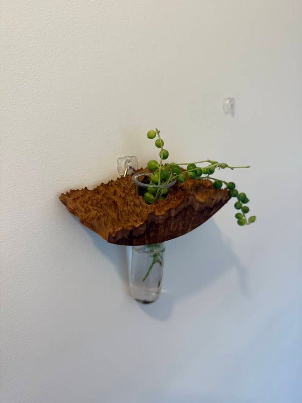Includes a glass test tube which fits into the hole in the timber - suitable for cut flowers and propagating plants. Also has a secure d-ring so you can hang from a hook (either metal or removable stick on).