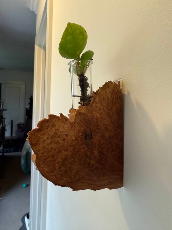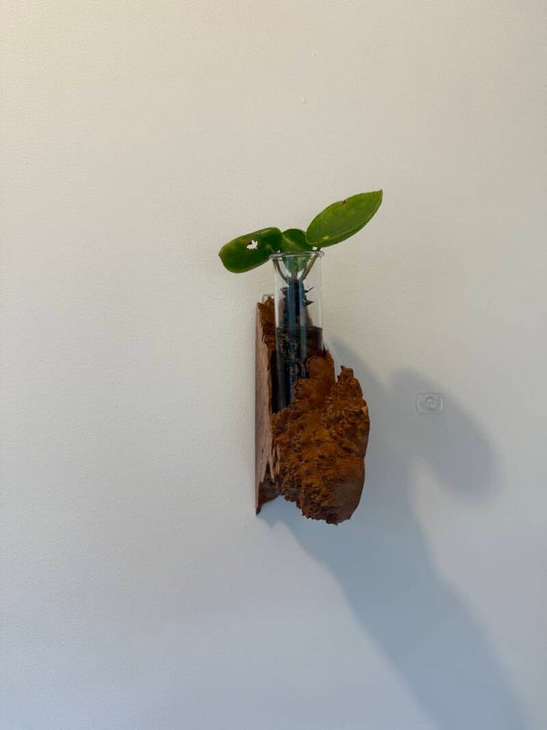 Includes a glass test tube which fits into the hole in the timber - suitable for cut flowers and propagating plants. Also has has a secure d-ring so you can hang from a hook (either metal or removable stick on).